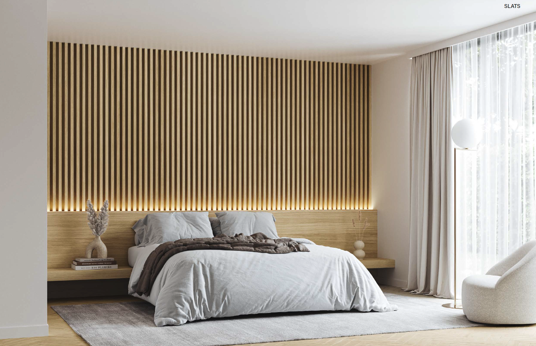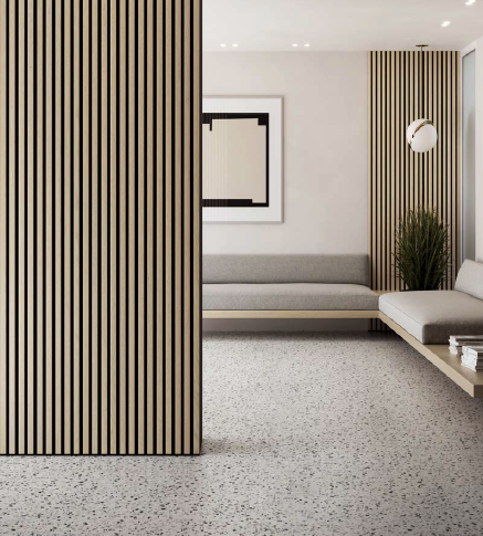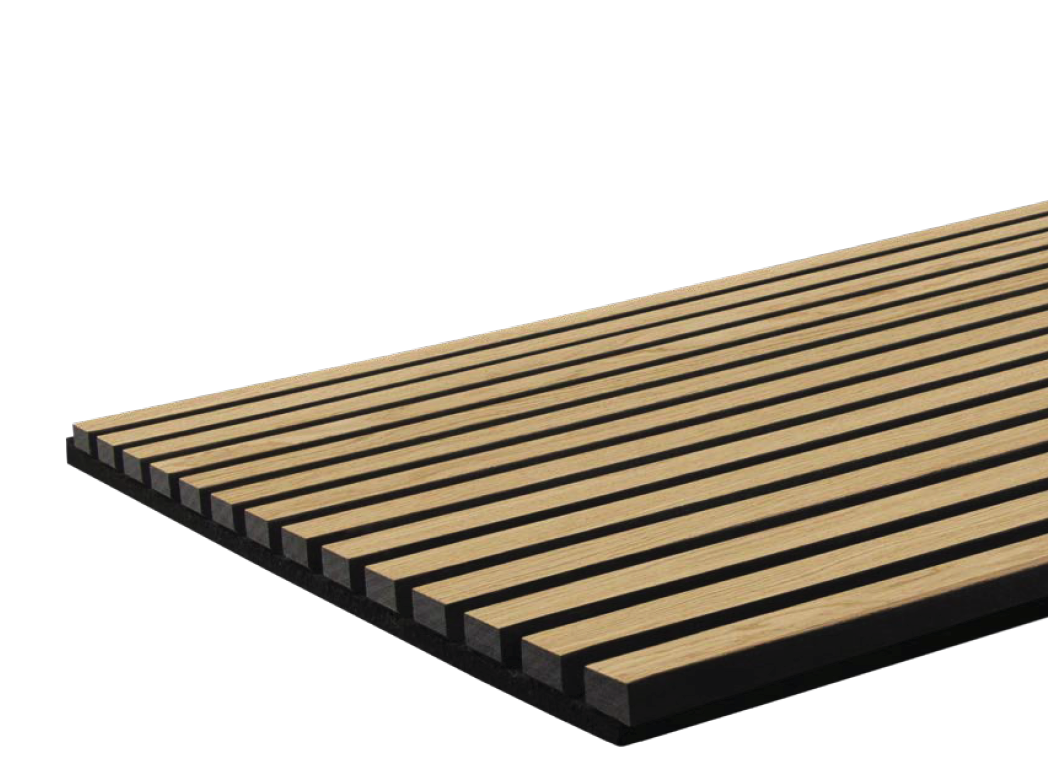 Astrata Coustics panels combine the elegance of pre-finished wood veneer with functional acoustic performance. Mounted on black MDF slats and adhered to a black felt backing, these panels are designed to enhance both sound absorption and visual appeal. As the perfect companion to Astrata Slats and Shinnoki panels, Astrata Coustics can be paired with additional sound-absorbing materials for optimized acoustic performance, making them ideal for modern workspaces, hospitality venues, and residential interiors.