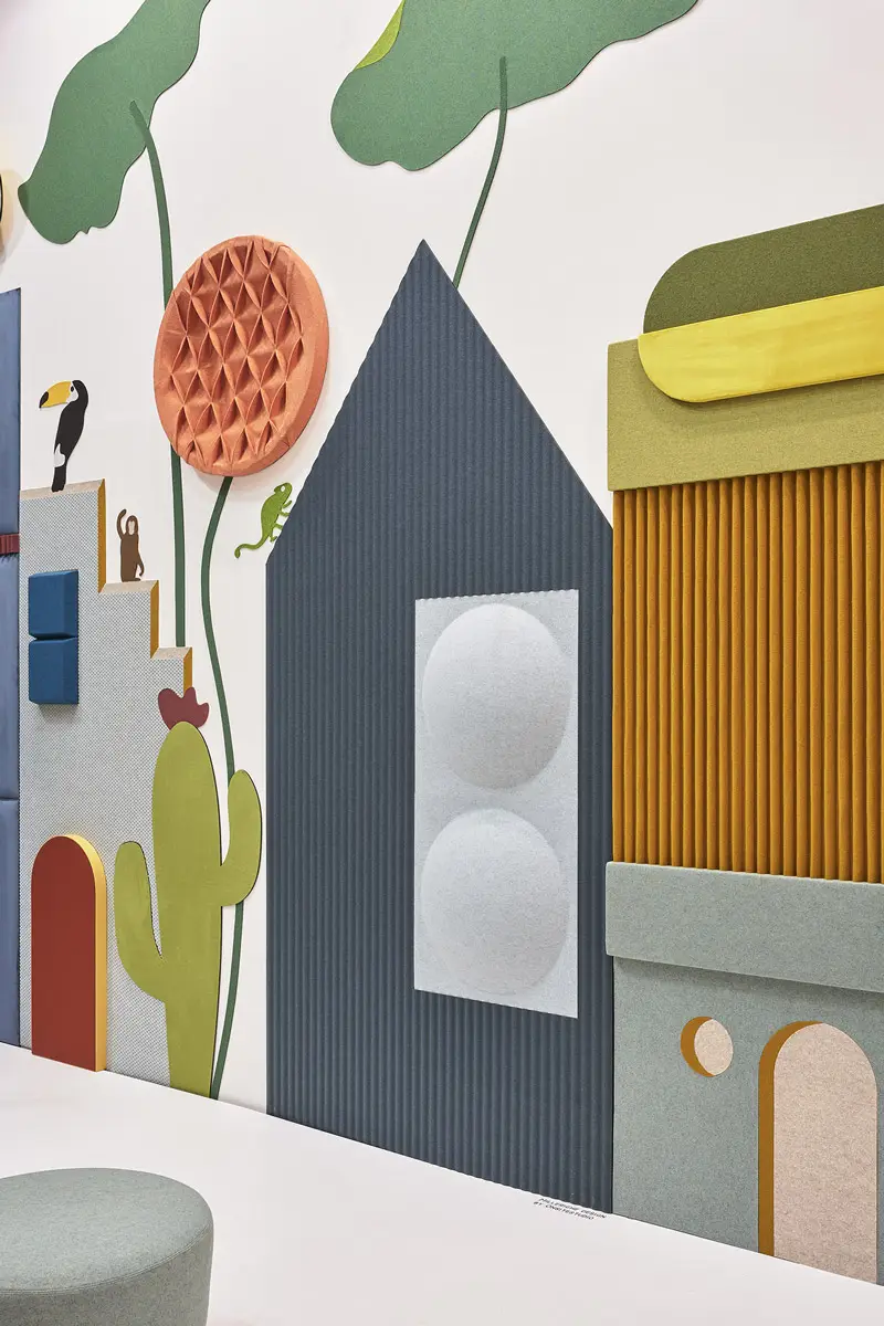 Single-material sound absorbing thermoformed panel. Apply to the wall with velcro. Can be cleaned with a vacuum-cleaner with a smooth spout or brush with soft bristles or by professional upholstery cleaners.